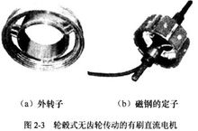 ②有刷印制繞組電機。有刷印制繞組電機以印制銅箔板作為繞組,電機重量減輕了。由于這種電機全部是在自動生產線上生產的,工藝有可靠保證,從而使電機的壽命提高到3000h,噪聲大幅度下降,效率提高到72%~76%。但這種電機有“嗡嗡”的高頻噪聲,靠齒輪減速后效率仍不理想,有刷換相器的使用使電機壽命無法再提高。