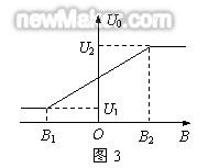 輸出電壓與外加磁場強度呈線性關系,如圖3所示,可見,在B1~B2的磁感應強度范圍內有較好的線性度,磁感應強度超出此范圍時則呈現飽和狀態。