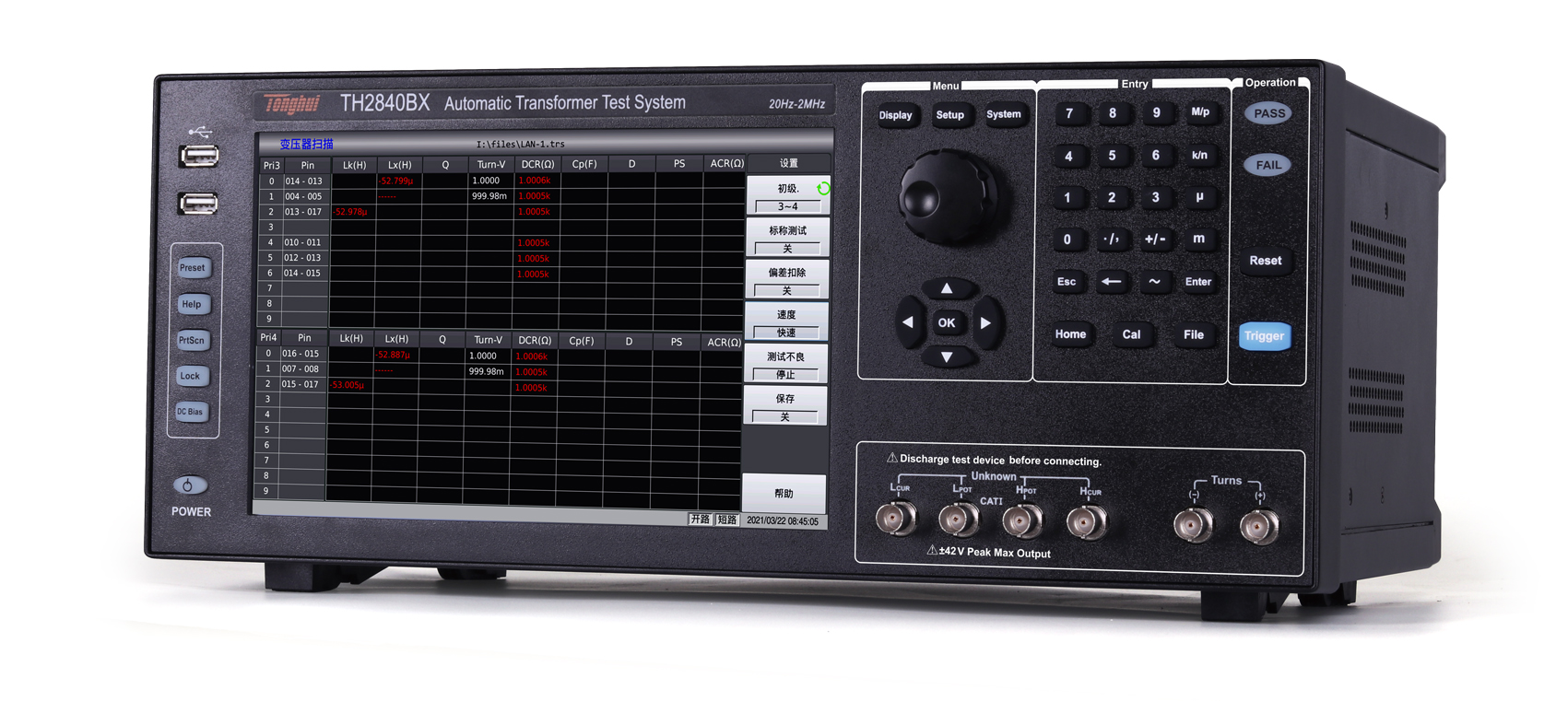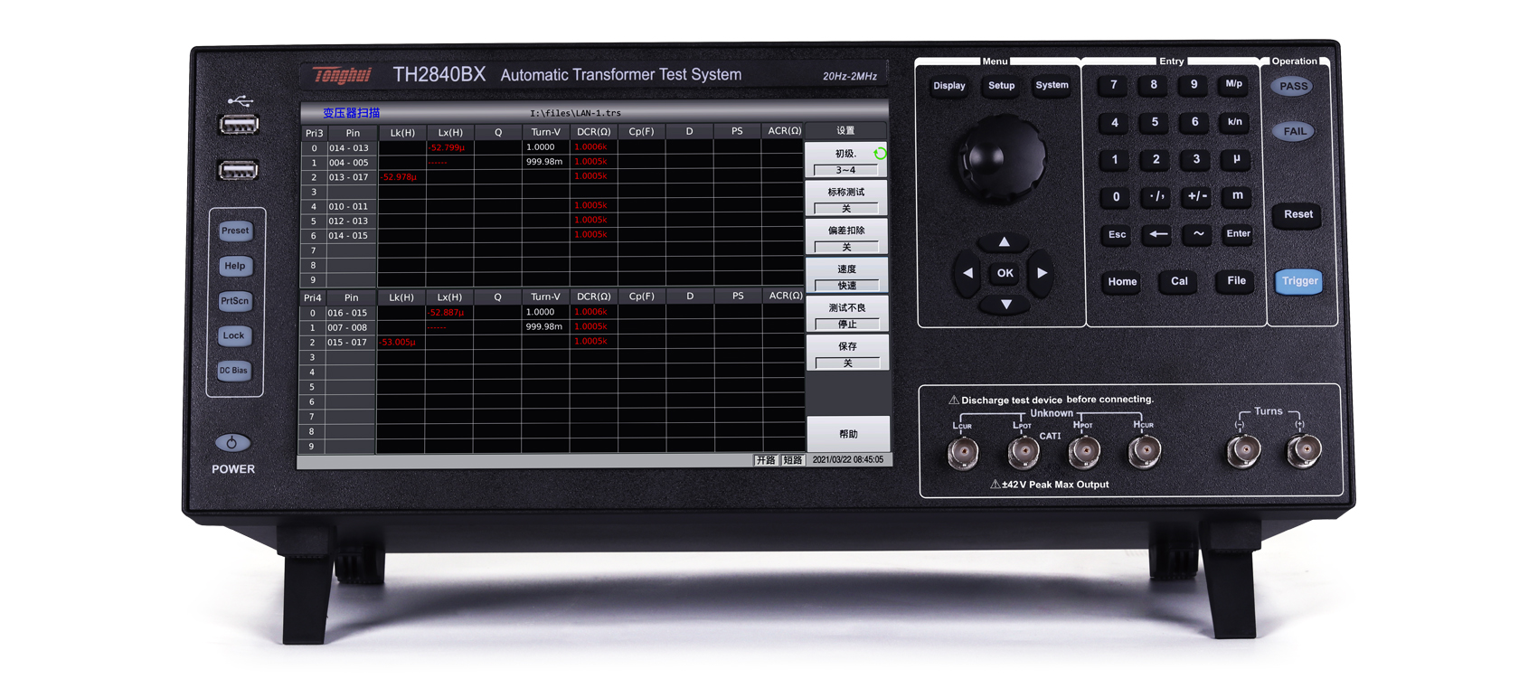 TH2840X系列自動變壓器測試系統是常州同惠電子在多年變壓器測試的經驗上,采用了新一代技術成功的新一代自動變壓器測試系統,創新性的采用了雙CPU架構、Linux底層系統、10.1寸電容式觸摸屏、中英文操作界面、內置使用說明及幫助等新一代技術,解決了以往測試系統設置繁瑣、測試速度慢、顯示不全、PIN腳位不足等缺陷。