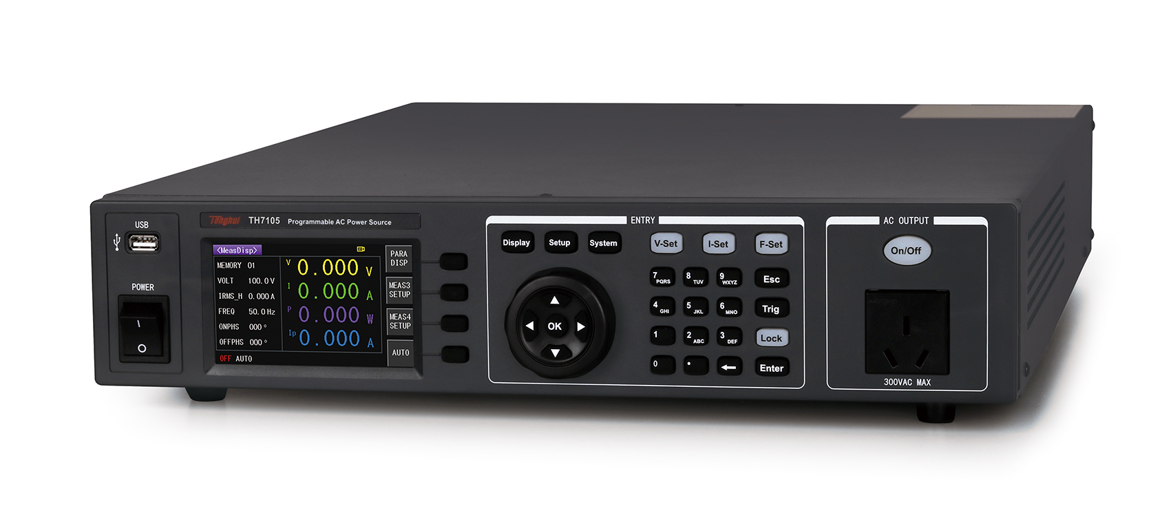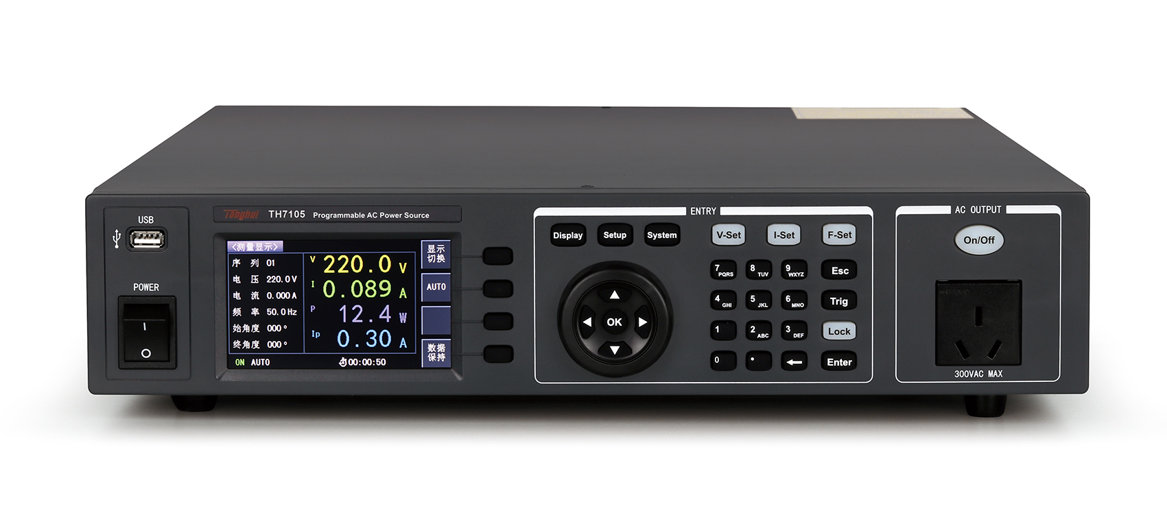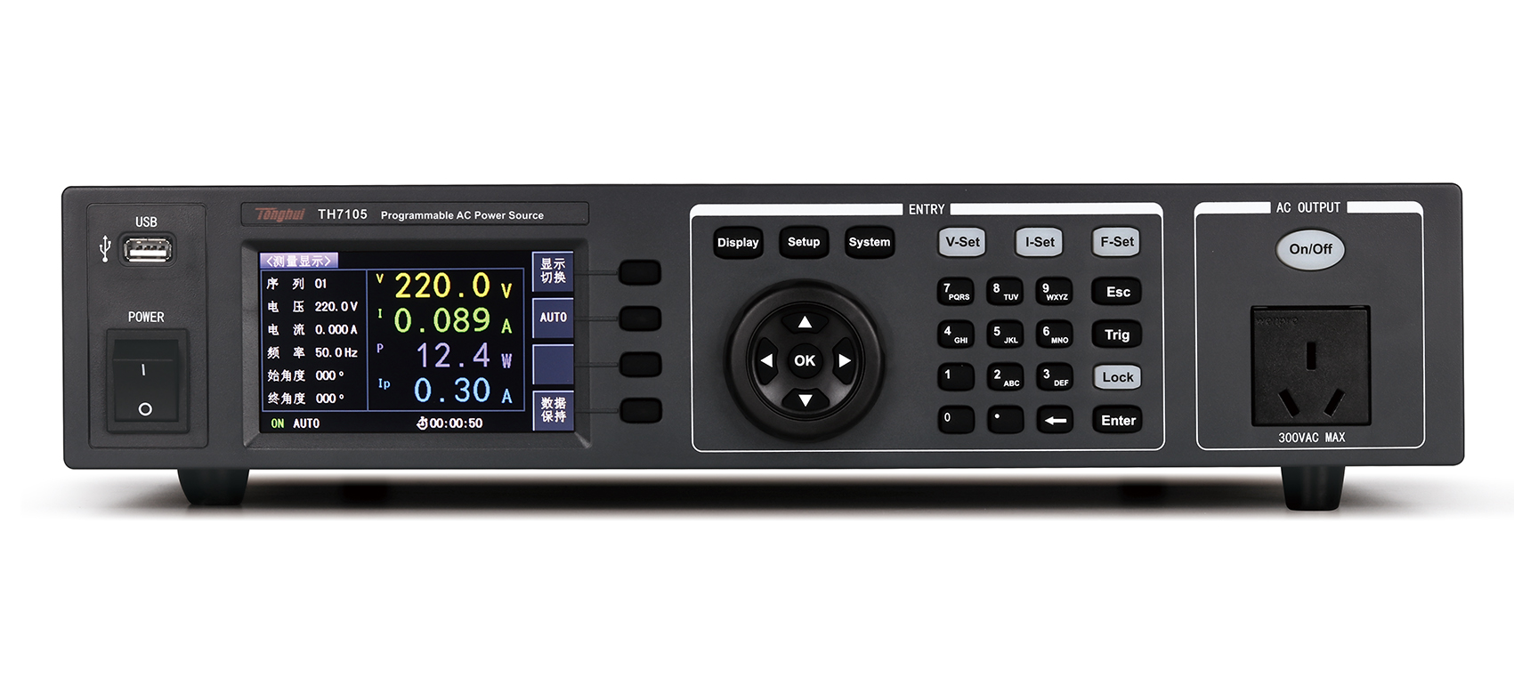 TH7100系列可編程交流電源配備了24位色4.3英寸的液晶顯示屏,可同時顯示電壓(V)、電流(I)、功率(P)、峰值電流(AP)、峰值因素(CF)、功率因數(PF)等測量參數。此外,這款電源還具有超小體積,前后面板輸出,安全保護功能完備、操作靈活方便等人性化的設計特點。