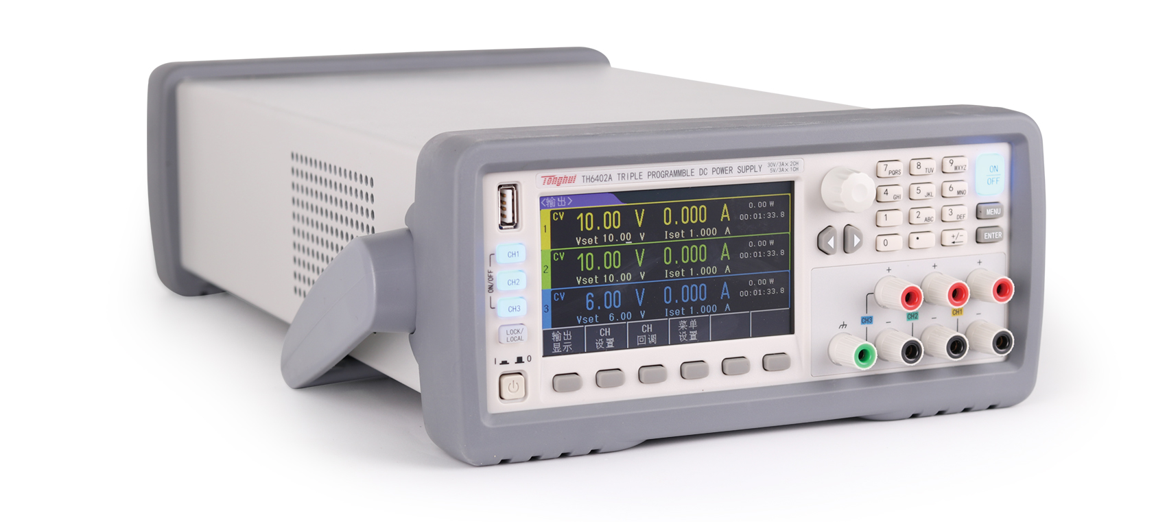 TH6400系列電源均為線性、程控輸出設計,因此該系列電源具有紋波小、噪聲低、精度高、穩定性強的卓越性能。全系列采用4.3寸TFT LED顯示屏,不同通道分屏顯示,并以高對比度的顏色加以區分。UI設計方面儀器采用菜單化操作,軟鍵、旋鈕控制及輸入參數,使用起來方便快捷,能很好的適應產線快速操作以及高校、實驗室的應用需求。