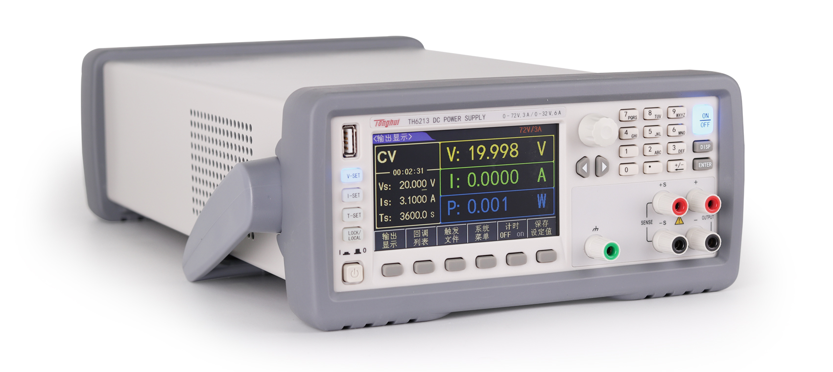 TH6200系列電源均為線性、程控輸出設計,因此該系列電源具有紋波小、噪聲低、精度高、穩定性強的卓越性能。全系列采用4.3寸TFT LED顯示屏,所有設置與輸出參數同屏顯示,使用起來更加直觀。UI設計方面儀器采用菜單化操作,軟鍵、旋鈕控制及輸入參數,使用起來方便快捷,能很好的適應產線快速操作以及高校、實驗室的應用需求。